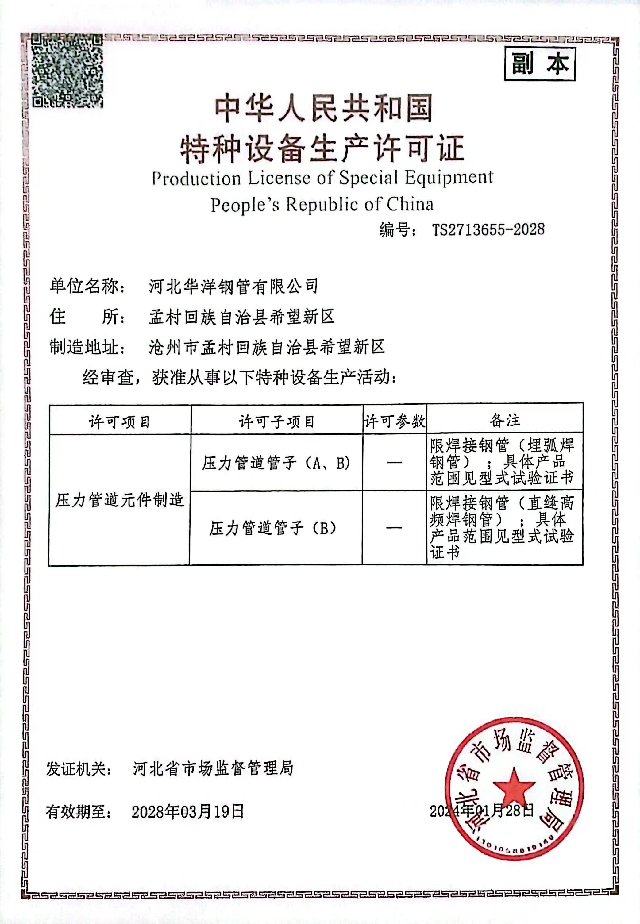公司現有17條新型的自動化鋼管生產線,包括Φ73-660.4高頻直縫焊鋼管生產線14條、Φ406.4-Φ1422.4直縫雙面埋弧焊鋼管生產線3條,并配備有一條防腐生產線,可進行3PE、2PE、FBE、2PP、3PP防腐處理,同時還可提供鋼管深加工服務。公司擁有先進的理化實驗室,可承擔鋼管的各項物理及化學檢測與試驗。公司先后取得了ISO9001質量管理體系認證、ISO14001環境管理體系認證、ISO45001職業健康安全管理體系認證、特種設備制造許可證、API5L和API2B認證證書、歐盟CE認證、俄羅斯GOST認證、法國船級社(BV)工廠認證、科威特石油入網認證、中海油入網證、安全生產標準化二級企業等標準質量體系認證。